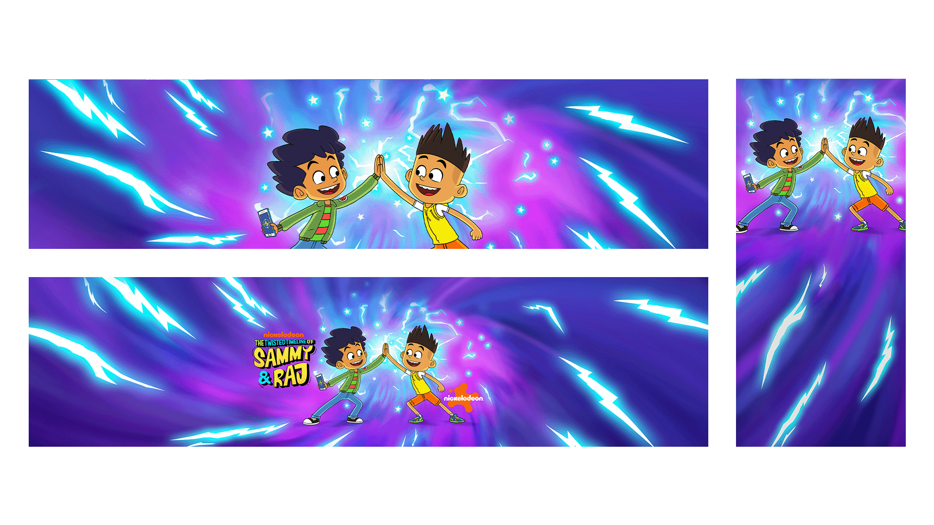 Often my retouching and illustration skills in demand during the course of a project at Nickelodeon. For example, painting in a tricky background extension for particularly wide or tall assets like this Key Art for The Twisted Timeline of Sammy & Raj was needed before building the assets for the DTO platforms.