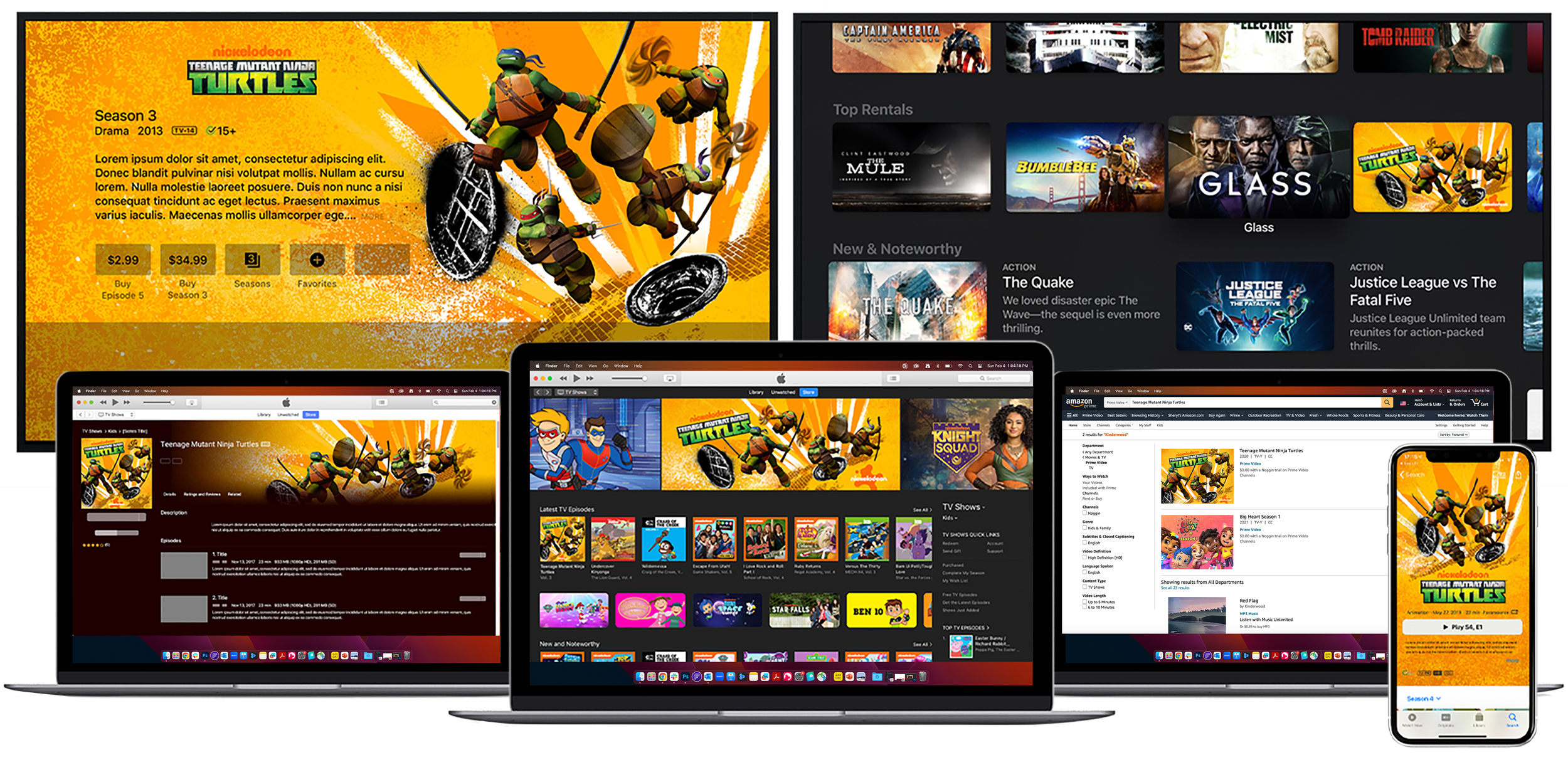 Using the vertical and horizontal Key Art (shown to the left) I made all the assets for every Download To Own (DTO) platform that offers Nickelodeon content. This includes Amazon, Apple iTunes, Apple TV, Google Play, Verizon, VUDU and Xbox. Building visual assets to pair seamlessly with the platform’s UI while showing the best side of the Nickelodeon content.